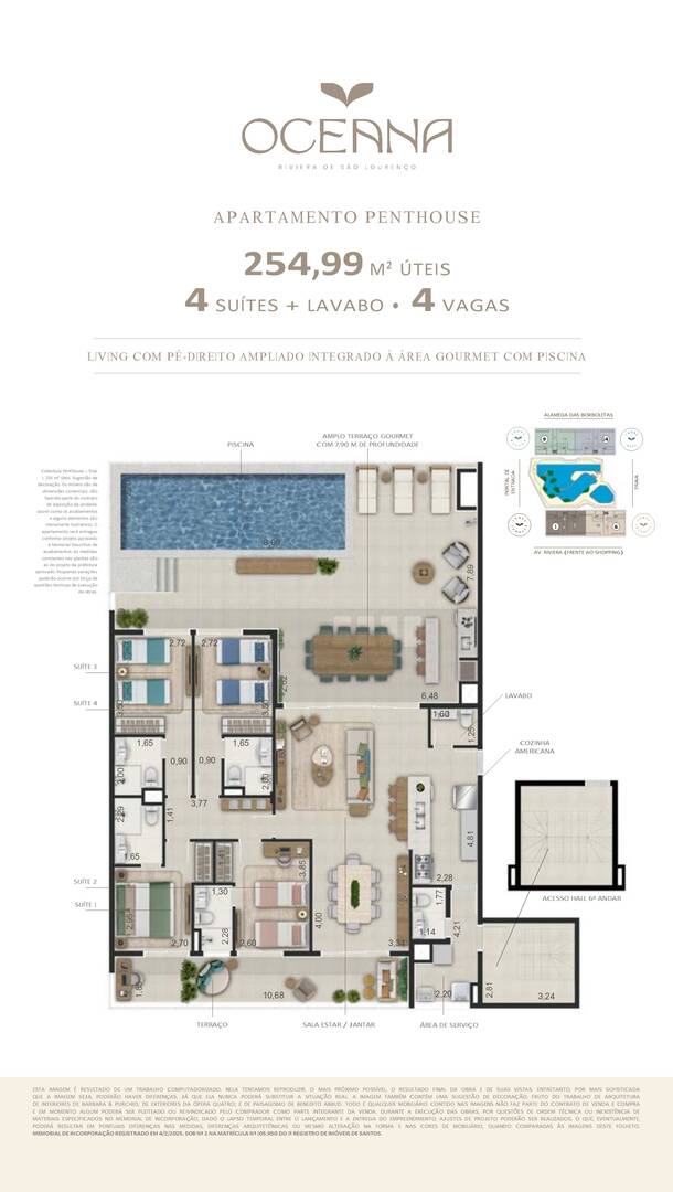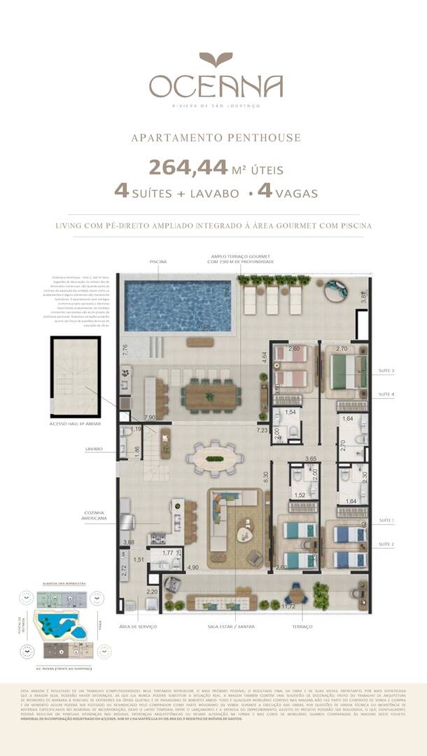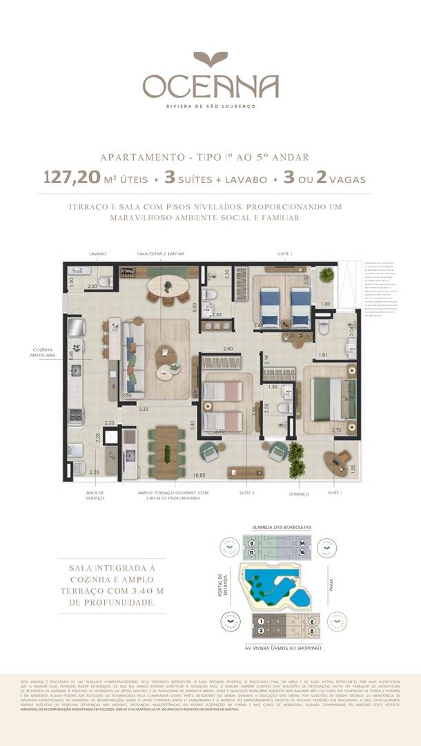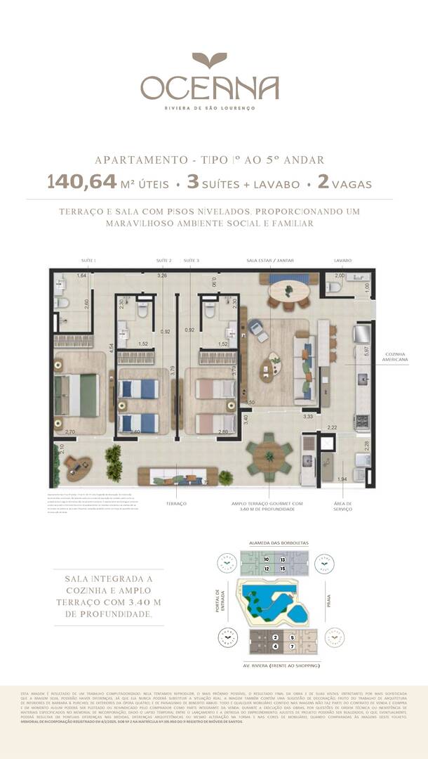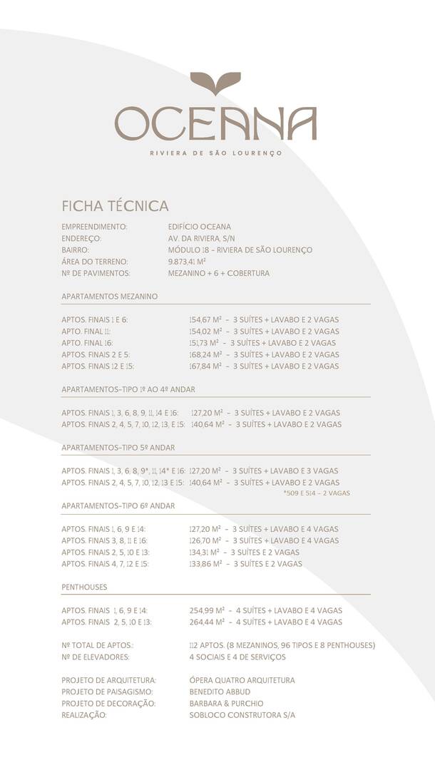 O Empreendimento Oceana, esta localizado em frente ao shopping da Riviera de São Lourenço, com um projeto pensando no meio ambiente, com um terreno de 9.800m², contará com 2 torres formados por Térreo + Mezanino + 6 Pavimentos + Cobertura Penthouse.