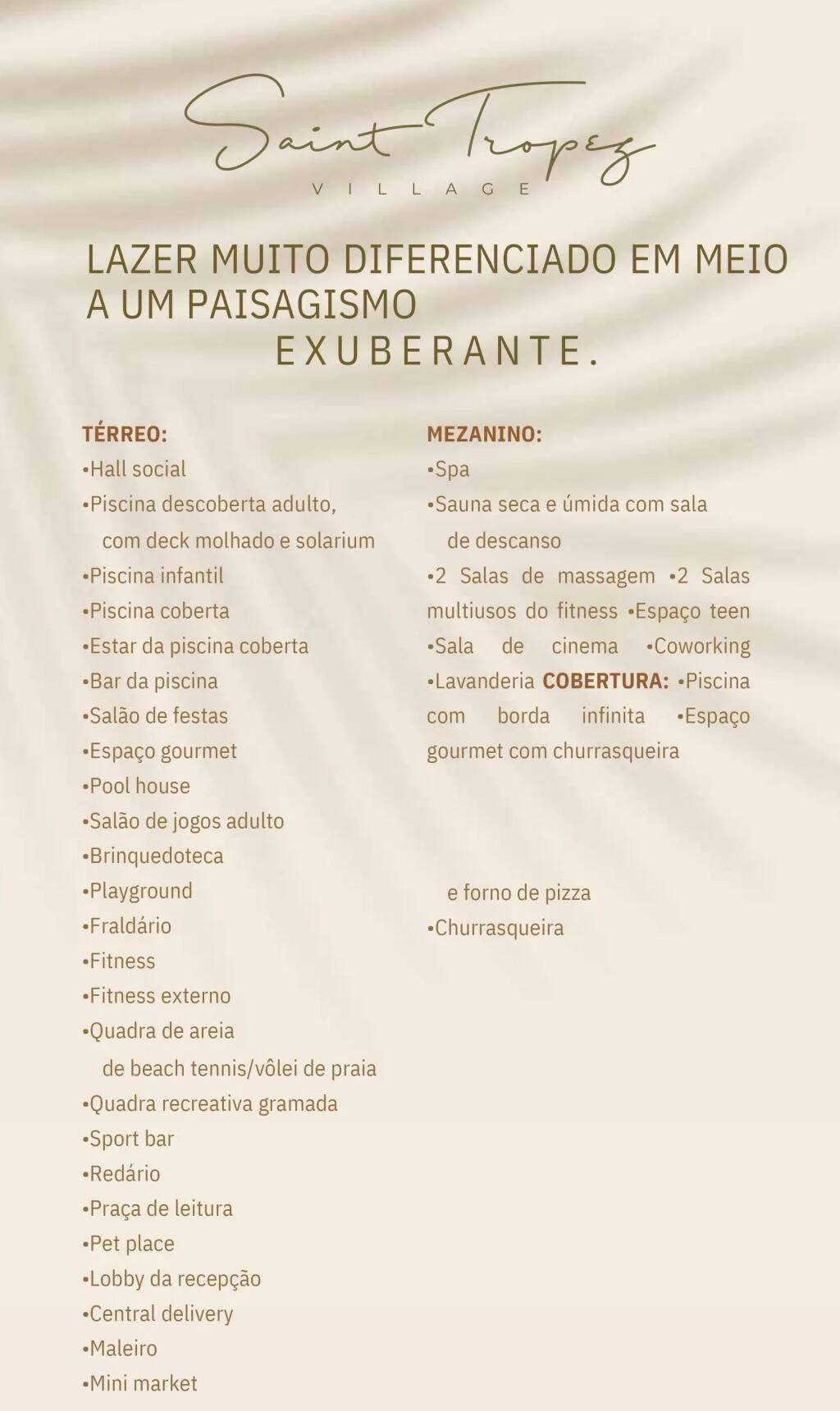 MEZANINO: •Spa •Sauna seca e úmida com sala de descanso •2 Salas de massagem •2 Salas multiusos do fitness •Espaço teen •Sala de cinema •Coworking •Lavanderia